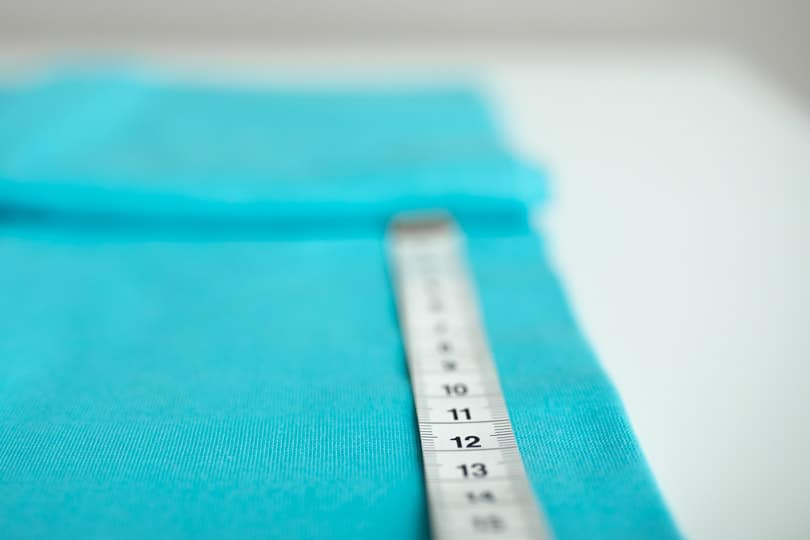 Dafür gehen wir ähnlich vor, wie schon zuvor bei der Ausrichtung unseres Stoffes: Zunächst wird das Schnittteil am Bruch des Stoffes platziert. Anschließend nehmen wir erneut das Maßband zur Hand und messen in regelmäßigen Abständen die Strecke von der Fadenlaufmarkierung bis zum Bruch unseres Stoffes nach und verschieben das Schnittteil so, dass die Abstände auf der gesamten Strecke gleich lang sind.