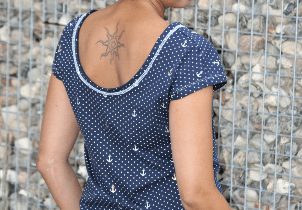 Wenn dann zusätzlich auch noch der restliche Stoff vom Zuschneidetisch einfach runterhängt, entsteht ein leichter Zug an dem Stoff, inklusive dem Teil, der auf dem Tisch liegt und auf die Schere wartet. In meinem Fall ist das Ergebnis, dass durch den Zug am Stoff, der Rückenausschnitt ca. 2 cm tiefer ist, als eigentlich vorgesehen ….. Somit muss jetzt mein Rücken entzücken.